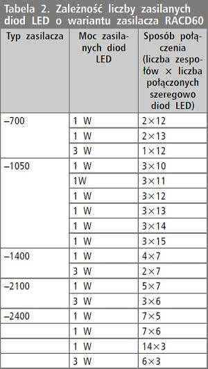 Zasilacz RACD60 jest oferowany w wariantach mających tę samą moc, natomiast różniących się napięciem wyjściowym i prądem obciążenia. Te warianty wymieniono w tabeli 1. Każdy konstruktor elektronik zapewne czuje intuicyjnie, że różne warianty są przeznaczone do zasilania różnych zespołów diod LED. W tabeli 2 pokazano zależność typu zasilacza od liczby zasilanych zespołów diod LED. Korzystając z tych danych można dobrać odpowiedni typ do projektowanej aplikacji.