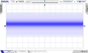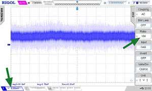 Cel ten został osiągnięty z niezłym skutkiem, o czym świadczy najniższy zakres pomiarowy - 500 mV/dz (z sondą 1:1). Oscyloskop jest jednak sprzedawany z sondami 10:1, bez możliwości przełączania stopnia podziału. Dla nich najmniejszy zakres pomiarowy jest równy 5 mV/dz. Dla porównania - w popularnych oscyloskopach cyfrowych parametr ten nie jest na ogół niższy niż 20 mV/V (dla sond 10:1). Szumy zmierzone oscyloskopem MSO2102A przy zwartym wejściu przedstawiono na (rysunku 1).