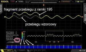 W tym celu wybiera się ramkę zawierającą poprawny fragment przebiegu i definiuje się ją jako ramkę wzorcową. Teraz, po naciśnięciu przycisku Start oscyloskop dokonuje porównania każdej zapisanej ramki z ramką wzorcową i dla każdej takiej pary oblicza procentową rozbieżność. Wynik tej operacji jest przedstawiany pod wykresem w formie graficznej jako pasek z paletą kolorów określających stopień dopasowania badanej ramki do wzorca.