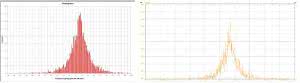 Jasność wyświetlania poszczególnych fragmentów oscylogramu jest proporcjonalna do częstości występowania poszczególnych amplitud w badanym sygnale. Niestety, w oscyloskopach Rigola nie ma funkcji wykreślającej histogram amplitud, który pozwoliłby weryfikować zgodność takiego szumu z założeniami teoretycznymi. Obserwując rozwój tej firmy można jednak przypuszczać, że w kolejnych modelach, albo wersjach oprogramowania funkcja taka pojawi się. Przykładową weryfikację przeprowadzono korzystając z innego, zewnętrznego narzędzia (rysunek 8b).
