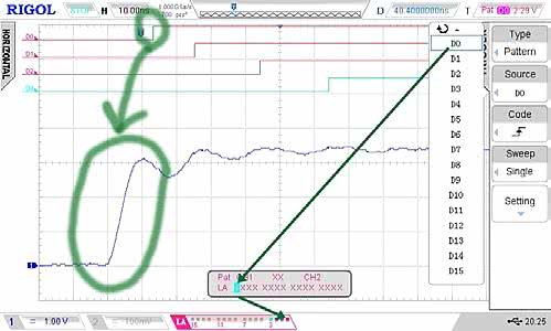 Sygnały przechwytywane przez sondę cyfrową mogą być wykorzystywane do ustalania warunku wyzwalania. Są to zarówno typowe zdarzenia, takie jak określone zbocze, szerokość impulsu itp., ale mogą być też formułowane sekwencje wzorcowe zdefiniowane jako kombinacja stanów na poszczególnych liniach cyfrowych. Trochę niezrozumiała jest przy tym zastosowana przez Rigola konwencja przyjmująca, że najmniej znaczące sygnały zajmują pozycje z lewej strony wzorca (rys. 11).