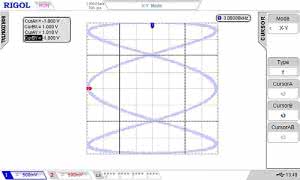 Pomiary kursorowe. Ten rodzaj pomiaru jest dostępny w każdym oscyloskopie cyfrowym. W modelu MSO2102A kursory mogą być przypisywane do wszystkich dostępnych kanałów analogowych i cyfrowych, a także do wirtualnych kanałów matematycznych. W oprogramowaniu oscyloskopu przewidziano także obsługę kursorów przy pracy w trybie X-Y (rysunek 13). Po wybraniu opcji "Manual" kursory są ustawiane w dowolnym położeniu za pomocą pokrętła uniwersalnego, ale wybierając tryb "Trace" można je dowiązywać do przebiegów.