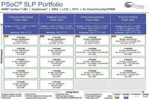 Rodzina PSoC5LP jest aktualnie najlepiej wyposażoną grupą układów Cypressa. Oprócz rdzenia Cortex M3 pracującego z zegarem 8 MHz, wspieranego wielokanałowym DMA, kontrolerem przerwań, wbudowaną pamięcią EEPROM, bogatym wyborem interfejsów szeregowych (UART, CAN, I²S, USB), interfejsami GPIO z możliwością obsługi klawiatur dotykowych, wyświetlaczy LCD oraz - co oczywiste - charakterystyczną dla PSoC matrycę konfigurowalnych bloków cyfrowych UDB (24) i konfigurowalny podsystem analogowy.