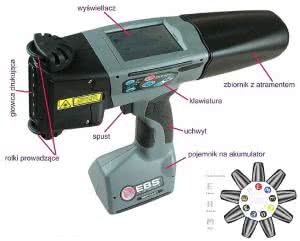 Drukarka ma kształt pistoletu. W czasie pracy użytkownik trzymając urządzenie za rękojeść skierowuje głowicę na powierzchnię, na której jest nanoszony napis. Głowicę tworzą 32 dyszki (fotografia 6), przez które są wyrzucane kropelki atramentu.