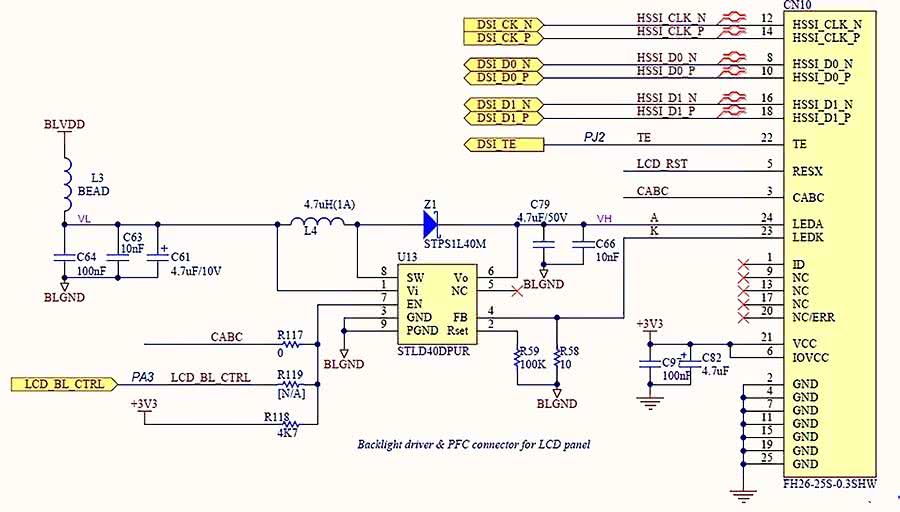 Podświetlacz zintegrowany z wyświetlaczem jest zasilany za pomocą przetwornicy DC/DC. Do wejścia EN przetwornicyU13 (rysunek 2) doprowadzono sygnał oznaczony jako CABC, który służy do regulacji jasności podświetlenia, do czego wykorzystano modulację PWM.