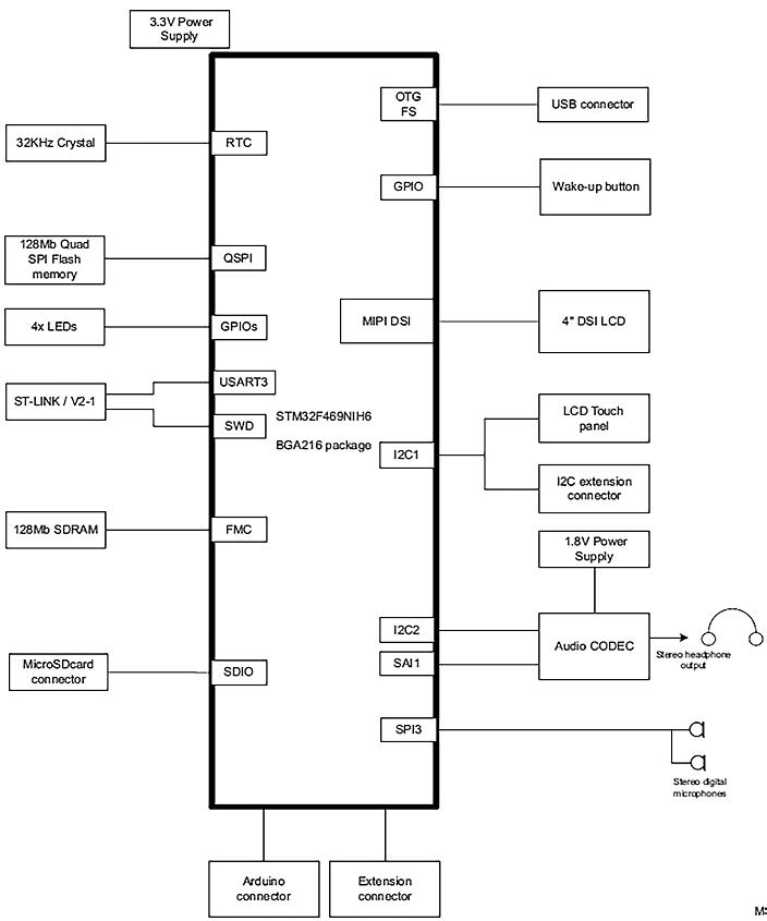 Zestaw STM32F469I-DISCO (fotografia 1) jest koncepcyjnie i wymiarami bliski klasycznym zestawom DISCOVERY, ale wyposażenie plasuje go w czołówce rozwiązań dostępnych na rynku. Dzieje się tak dzięki zastosowanemu w zestawie mikrokontrolerowi STM32F469NIH6, którego wewnętrzna pamięć Flash ma pojemność 2 MB, a wewnętrzny RAM - 324 kB.