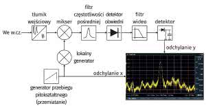Zasadę działania analizatora widma Spectrum Rider FPH przedstawiono na rysunku 1. Pierwszym elementem toru pomiarowego jest tłumik zabezpieczający następne stopnie przed trwałym uszkodzeniem. Nie jest o to trudno przy nieumiejętnej obsłudze urządzenia.