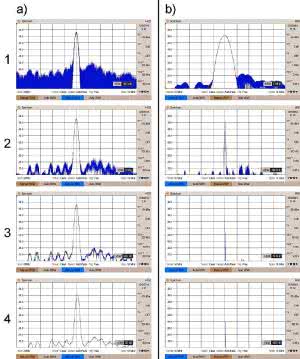 Wpływ parametrów "RBW" i "VBW" na wygląd wyświetlanego na ekranie widma przedstawiono na rysunku 2. Jak widać, szczególnie istotne jest ustawienie rozdzielczości. Zbyt duża wartość parametru "RBW" powoduje, że widmo nienaturalnie rozmywa się (rysunek 1b-1), natomiast zbyt mała wartość może powodować znaczne zmniejszenie poziomów (rysunek 1b-4), a czasami wręcz pominięcie niektórych wartości. Nieodpowiednie dobranie parametru VBW może natomiast utrudnić dokładny odczyt poziomu, ze względu na duże zaszumienie sygnału.