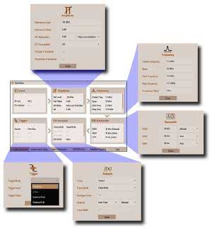 - AMPT - parametry związane z konfiguracją osi pionowej wykresu, takie jak: poziom referencyjny, zakres wyświetlanych poziomów, stosowane jednostki, offset poziomu odniesienia, parametry tłumika i (ewentualnie) wzmacniacza wejściowego, impedancja wejściowa oraz parametry przetworników,