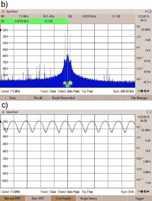 - SPAN - ustawianie zakresu przemiatania, opcja "ZERO SPAN" powoduje przełączenie analizatora do pracy w dziedzinie czasu, w której na ekranie jest wyświetlana obwiednia uzyskiwana z detektora obwiedni. Na rysunku 5a przedstawiono przebieg (w dziedzinie czasu), który powstał w wyniku modulacji amplitudowej sygnału 7,5 MHz sygnałem sinusoidalnym o częstotliwości ok. 10 kHz. Na rysunku 5b widoczne jest widmo sygnału zmodulowanego. Wyraźnie można na nim zaobserwować dwa prążki oddalone o ok. 10 kHz od nośnej, charakterystyczne dla modulacji AM. Na rysunku 10c przedstawiono ten sam przebieg przy włączonej opcji ZERO SPAN.