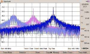 - TRACE - ustawianie trybów pracy detektora. Była już o tym mowa w części opisującej zasadę pracy analizatora. Dodatkowo opcja ta umożliwia zapisywanie dwóch wykresów w pamięci śladu, które mogą być następnie wyświetlane na przykład w celu porównania. Na rysunku 6 przedstawiono przykładowe porównanie pasma zajmowanego przez kanały 2, 4 i 6 radia PMR.