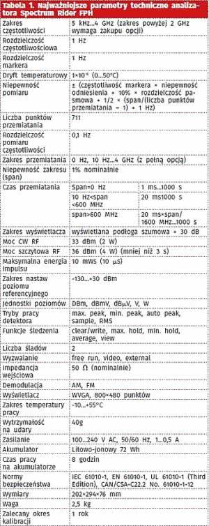 Spectrum Rider FPH jest przystosowany do współpracy z komputerem. Może łączyć się z nim za pośrednictwem interfejsu WiFi lub USB. Wbudowana pamięć Flash (32 GB karta micro SD) umożliwia rejestrację wyników pomiarów, zrzutów ekranowych i konfiguracji przyrządu. Obsługę ułatwia ekran dotykowy. Możliwe jest też bezpośrednie drukowanie raportów pomiarowych. Najważniejsze dane techniczne analizatora Spectrum Rider FPH zebrano w tabeli 1.