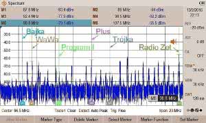- MARKER - markery to jedno z podstawowych narzędzi pomiarowych stosowanych w analizatorach widma. W analizatorze Spectrum Rider FPH można włączyć jednocześnie 6 markerów. Są one przydatne do określania parametrów widma (częstotliwość, poziom). Na rysunku 7 przedstawiono zakres częstotliwości radiowych zmierzonych w Warszawie z zaznaczonymi za pomocą markerów kilkoma wybranymi stacjami. Markery mogą określać częstotliwości bezwzględne - odpowiadające pozycji markera lub względne - określające odstęp częstotliwości danego markera od markera referencyjnego (M1). Markery umożliwiają także przeprowadzenie kilku specyficznych pomiarów. Jednym z nich jest pomiar gęstości mocy szumów. Aby go wykonać wystarczy ustawić kursor na odpowiedniej częstotliwości i włączyć opcję "Marker Function"->"Noise". Wynik jest wyświetlany w górnej części ekranu przy parametrach markera (rysunek 8).