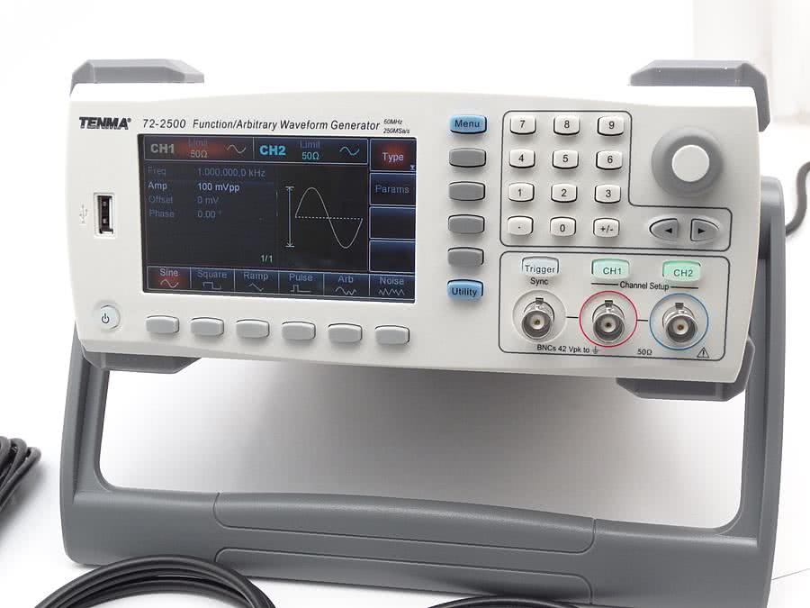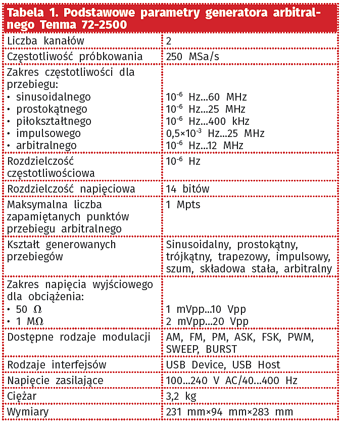 Generator arbitralny Tenma 72-2500 jest przyrządem wykorzystującym technikę DDS do tworzenia niemal dowolnych przebiegów dostępnych na wyjściach 2 kanałów. Rozdzielczość częstotliwościowa przebiegu sięga 10-6 Hz (1 mHz), natomiast napięcie wyjściowe jest ustalane z rozdzielczością 14 bitów. Zakres napięcia wyjściowego rozciąga się od 1 mVpp do 10 Vpp na obciążeniu 50 V oraz od 2 mVpp do 20 Vpp na obciążeniu 1 MV. Częstotliwość przebiegu wyjściowego wynosi do 60 MHz dla napięcia sinusoidalnego i do 25 MHz dla przebiegu prostokątnego. Jak przystało na generator arbitralny, użytkownik ma możliwość ustawiania stromości zboczy i współczynnika wypełnienia przebiegu prostokątnego.