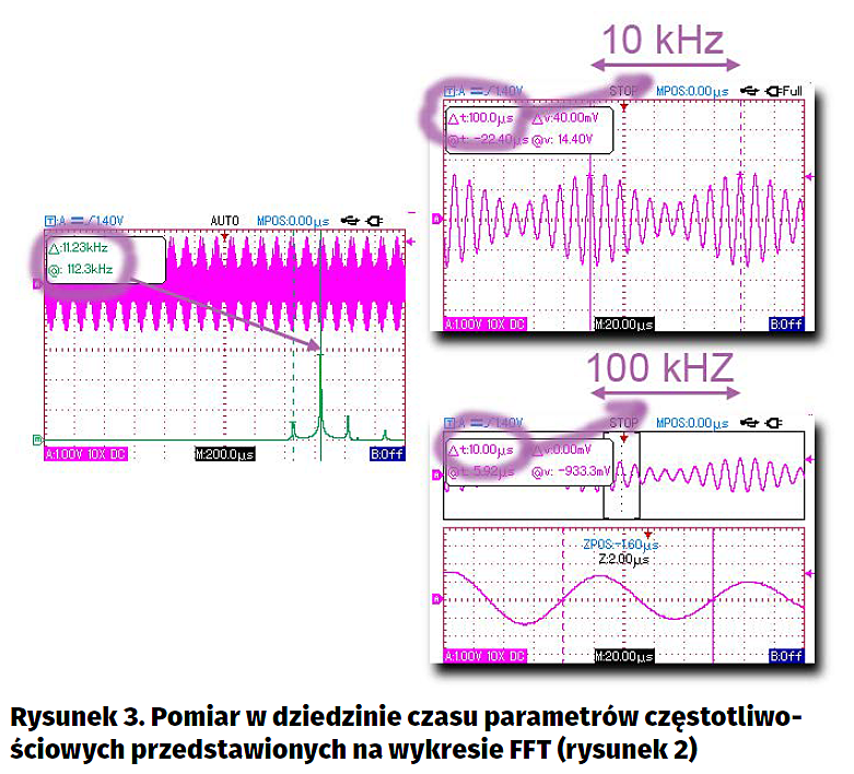 W skład operacji matematycznych wchodzi jeszcze funkcja FFT. Za jej pomocą można badać widmo sygnału, ale w firmwerze 72-9355 występuje dość duży błąd obliczania częstotliwości prążków. Przykładowo, widmo sygnału sinusoidalnego o częstotliwości 100 kHz zmodulowanego amplitudowo sinusoidą o częstotliwości 10 kHz powinno zawierać prążek główny 100 kHz i dwa listki boczne: 90 kHz i 110 kHz. Tymczasem w wyniku pomiaru tego sygnału funkcją FFT uzyskano częstotliwość prążka głównego 112,3 kHz (rysunek 2). Trudno stwierdzić przyczynę tej dość sporej różnicy. Należy pamiętać, że do obliczenia widma wykorzystywane są 1024 punkty. Przed pomiarami warto też upewnić się, w jakim trybie przebiega próbkowanie – w czasie rzeczywistym czy ekwiwalentnym. W drugim przypadku szybkość próbkowania wzrasta do 25 GSa/s, ale jest to oczywiście tylko pozorny zabieg techniczny, który może być stosowany wyłącznie dla sygnałów okresowych. Pomiar sygnału z rysunku 2 przeprowadzony w dziedzinie czasu z użyciem kursorów dał wyniki poprawne (rysunku 3).