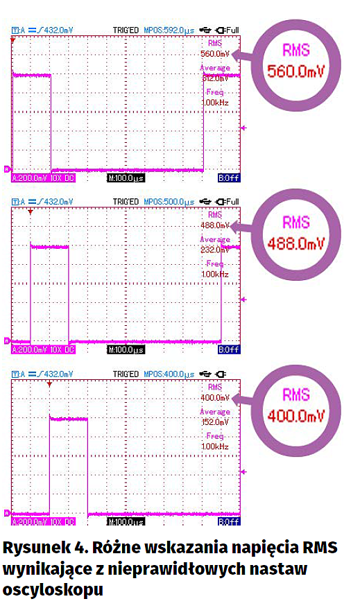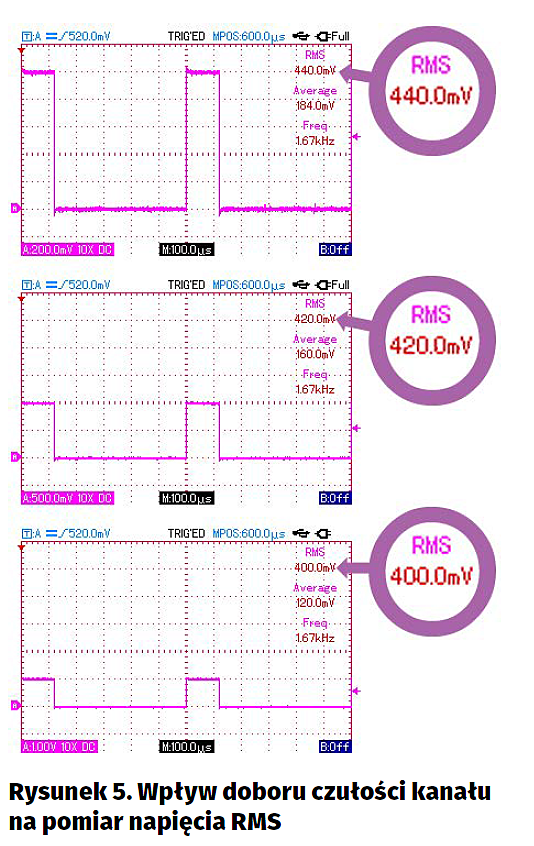 Trudno wyobrazić sobie oscyloskop cyfrowy bez pomiarów automatycznych. W 72-9355 możliwe jest wykonanie automatycznych pomiarów 27 parametrów. Trzeba jednak pamiętać o tym, że nastawy przyrządu mogą w pewnym stopniu wpływać na dokładność pomiarów. Jest to uwaga ogólna, której nie należy wiązać wyłącznie z opisywanym modelem oscyloskopu. Przykładem niech będzie pomiar napięcia RMS w przypadku, gdy na ekranie mieści się niepełna wielokrotność okresów przebiegu. Zmierzona funkcją automatycznych pomiarów wartość skuteczna RMS może różnić się od rzeczywistej, co przedstawiono na rysunku 4. W przypadku sygnałów o wypełnieniu 1/2 błędu można uniknąć, ustawiając punkt wyzwalania na środku ekranu. Należy ponadto pamiętać, że przetwornik analogowo-cyfrowy oscyloskopu ma 8-bitową rozdzielczość, co poza przyrządami najdroższymi jest zresztą standardem. Ma to jednak konsekwencję w postaci dokładności odczytywania napięć. Aby zapewnić jak najmniejszy błąd, należy tak dobierać czułość wejściową, aby przebieg wypełniał jak największą część ekranu w pionie. Wpływ doboru czułości wejściowej na wynik pomiaru napięć przedstawiono na rysunku 5.