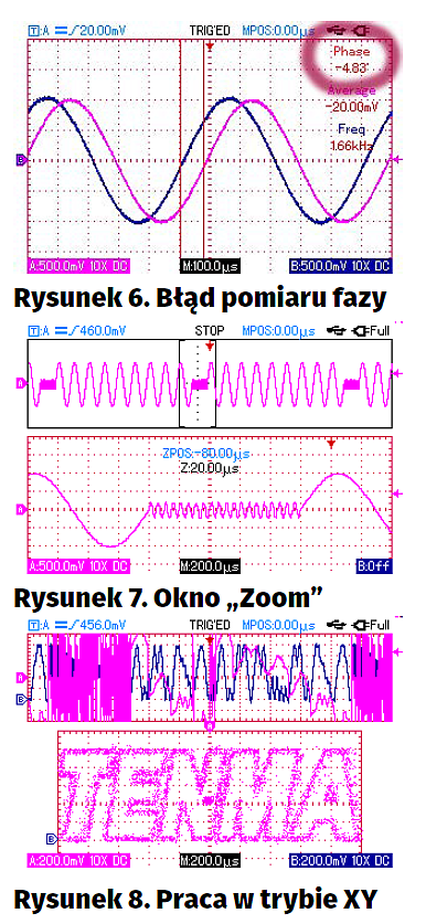 Do obserwowania zależności fazowych między dwoma sygnałami często wykorzystywany jest tryb XY. W oscyloskopach analogowych krzywe Lissajous były jedną z częściej stosowanych metod pomiaru przesunięć fazowych. W oscyloskopach cyfrowych użytkownika wyręczają w tym pomiary automatyczne, ale tryb XY nadal jest implementowany. Jest on wykorzystywany do badania wzajemnych relacji między dwoma sygnałami, np. UA=f(UB). Można go też użyć... choćby do twórczości artystycznej (rysunek8).