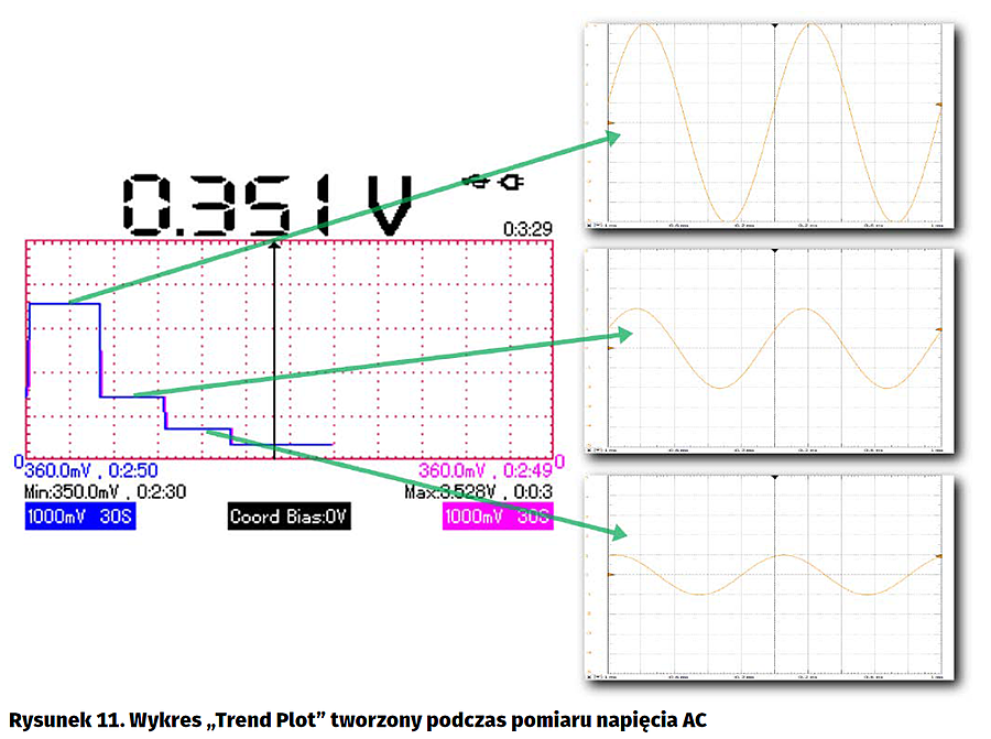 Miernik napięcia zmiennego. Charakterystykę częstotliwościową miernika przedstawiono na rysunku 10. Poniżej częstotliwości 5...7 Hz pomiar nie jest wiarygodny. Względnie stabilne odczyty zaczynają się powyżej tych częstotliwości. Biorąc pod uwagę charakterystykę częstotliwościową toru, należy uznać, że zakres pomiarowy obejmuje częstotliwości od 20 Hz do 2 kHz. W trybie miernika napięcia AC można też korzystać z rejestratora trendu (rysunek 11). Na ekranie jest wyświetlana ok. 6-minutowa historia pomiarów. Miernik V AC mierzy napięcia skuteczne bez składowej stałej.