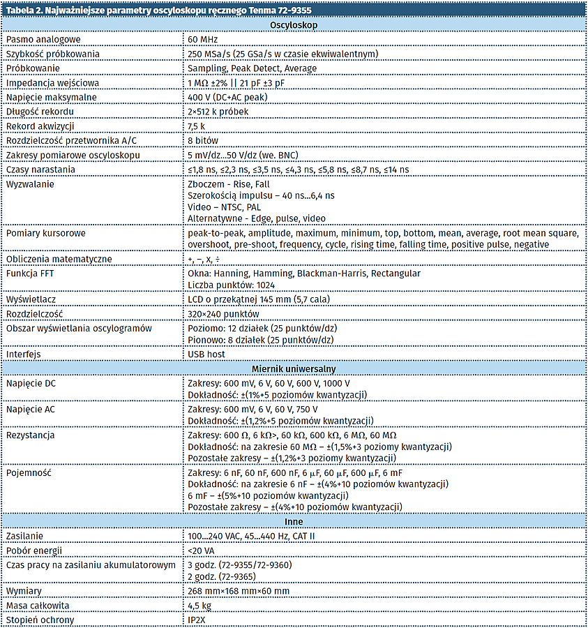 Oscyloskopu ręcznego Tenma 72-9355 nie można zakwalifikować do wyrobów z górnej półki. Jest to dość prosty przyrząd, który powinien spełnić oczekiwania inżynierów produkcji, elektryków motoryzacyjnych i pewnej grupy serwisantów. Konstruktorzy i projektanci mogą już mieć wyższe wymagania. Nie można jednak nie zauważyć, że cena tego przyrządu jest ok. 6-krotnie niższa od ceny podobnego miernika jednego z prawdziwych liderów światowych.