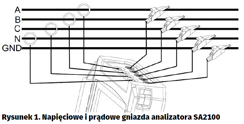 W pomiarach sieci 3-fazowych plątanina przewodów pomiarowych może być całkiem spora, zalecana jest więc daleko posunięta dyscyplina i zachowanie porządku na stanowisku pomiarowym. Najbardziej złożone konfiguracje wykorzystują 9 przewodów – 3 przewody napięciowe i 3 pętle prądowe dołączane do linii fazowych, 1 przewód napięciowy i 1 pętla prądowa dołączana do linii neutralnej i 1 przewód napięciowy dołączany do uziemienia (rysunek 1). Dla zapewnienia prawidłowego pomiaru kątów fazowych prądu należy zadbać o jednakową orientację pętli prądowych. Przydatne są w tym odpowiednie oznaczenia graficzne umieszczone na pętlach.