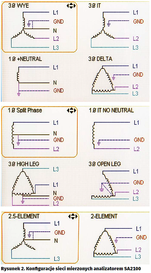 Przed przystąpieniem do pomiarów należy bardzo dokładnie rozpoznać typ sieci, która będzie mierzona, a następnie wybrać odpowiadającą jej konfigurację połączeń z menu „Set-