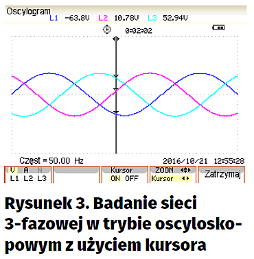 Pomiary zwykle rozpoczynają się od szybkiego przeglądu stanu sieci i wstępnej oceny parametrów. Wykorzystywany jest do tego tryb oscyloskopowy (Scope mode), w którym można obserwować poszczególne przebiegi napięć i prądów tak jak na oscyloskopie. Prosty kursor jest przydatny do oceny wartości chwilowych tych przebiegów (rysunek 3). Możliwe jest także powiększanie i rozciąganie oscylogramów w pewnym zakresie.