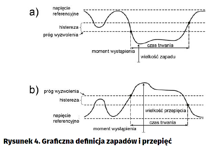 Szybkie skoki napięć i prądów (w górę lub w dół) są wykrywane pomiarem „Zapady i przepięcia” (Dips and Swells). Zakłócenia tego typu są określone normą IEC61000-4-30, ale parametry graniczne mogą być modyfikowane przez użytkownika. Graficzną definicję przedstawiono na rysunku 4. Każde zdarzenie tego typu jest zaznaczane na wykresie i zapisywane w specjalnym rejestrze. Użytkownik już po pomiarze może ten rejestr przeglądać. Jest w nim zapisany moment zdarzenia (data i godzina) oraz jego typ. W pomiarze są rozróżniane 4 zdarzenia: CHG – szybka zmiana napięcia, DIP – zapad napięcia, INT – przerwa napięcia, SWL – przepięcie.