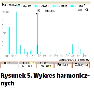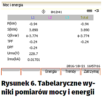 Opisywane w artykule urządzenie jest zaliczane do grupy analizatorów jakości energii, jednym z podstawowych pomiarów będzie więc pomiar mocy odbiorników elektrycznych i zużywana w określonym czasie energia. Parametry te są mierzone po wybraniu opcji „Moc i energia”. Wyniki są jak zwykle prezentowane w formie tabelarycznej (rysunek 6) lub w postaci wykresu trendu. Na podstawie pomiaru napięć i prądów w poszczególnych fazach miernik oblicza moc czynną, bierną i pozorną, a także współczynnik mocy (cos(w), ozn. TPF). Współczynnik mocy jest definiowany jako kosinus kąta między wektorem podstawowej harmonicznej prądu i napięcia. Parametr ten dobrze określa przesunięcia fazowe dla przebiegów nieodkształconych, ale wraz ze wzrostem harmonicznych jego wartość przestaje być miarodajna. Dlatego mierzone są dwa rodzaje współczynnika mocy: TPF (apparent power factor) uwzględniający wszystkie harmoniczne i DPF (displacement power factor), w którym uwzględniana jest tylko podstawowa harmoniczna. Po uaktywnieniu opcji „Energia” uruchamiany jest licznik czasu wykorzystywany do obliczania energii jako iloczynu mocy i czasu. Na podstawie przesunięcia fazowego między mocą bierną i rzeczywistą analizator określa charakter odbiornika energii. Jest on zaznaczany w postaci symbolu graficznego (kondensatora lub cewki) umieszczanego obok wyświetlanej mocy biernej.