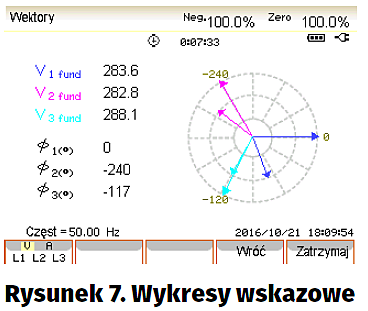 Kolejny pomiar – „Asymetria”, jest wykorzystywany do badania balansu między fazami. Najbardziej przemawiają wykresy wskazowe stanowiące graficzną interpretację wyników (rysunek 7). Na wykresach są rysowane wektory napięć i prądów, a na podstawie informacji podawanych w polach liczbowych można zorientować się o zależnościach ilościowych pomiędzy poszczególnymi parametrami. Pomiar balansu ma duże znaczenie m.in. dla użytkowników silników 3-fazowych. Zbyt duże przesunięcia fazowe powodują nadmierne rozgrzewanie się silnika, a w konsekwencji zwiększają prawdopodobieństwo wystąpienia uszkodzeń.