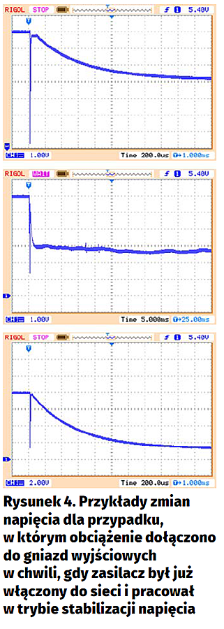 Podstawowym trybem pracy zasilacza jest stabilizowanie napięcia, sygnalizowane świeceniem zielonej lampki „C.V.”. Zasilacz utrzymuje stałe napięcie bez względu na zmieniające się obciążenie. Zmiany obciążenia nie powodują widocznych skutków na wyjściu, jeśli nie są zbyt gwałtowne. Przy skokowej zmianie może pojawić się niewielki impuls wynikający z czasu reakcji układu stabilizującego (rysunek 2). Na rysunku 3 przedstawiono kilka przykładowych przebiegów napięcia na obciążeniu dołączonym do gniazd wyjściowych po włączeniu zasilania. Zasilacz skonfigurowano do pracy w trybie ograniczenia prądowego. Wykresy z rysunku 4 wykonano natomiast w sytuacji, gdy obciążony zasilacz pracujący w trybie ograniczenia prądowego włączono do sieci.