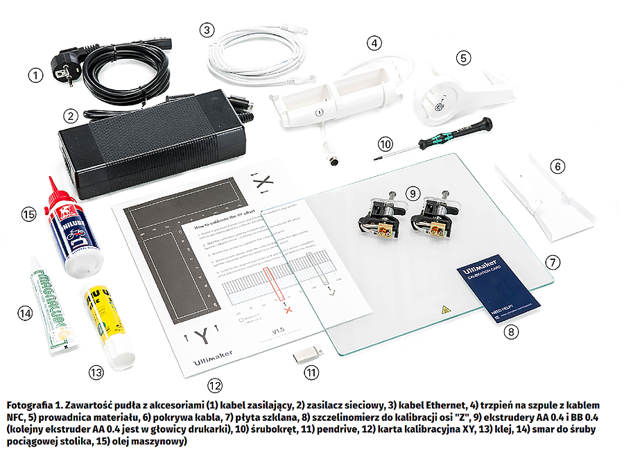 Drukarka Ultimaker 3 dotarła do redakcji nowiutka, pachnąca świeżością, zapakowana w oryginalne, fabryczne opakowanie, solidnie zabezpieczona z każdej strony specjalnie uformowaną, grubą warstwą styropianu. Na samej górze było pudło z akcesoriami oraz dwie szpule z filamentem.
