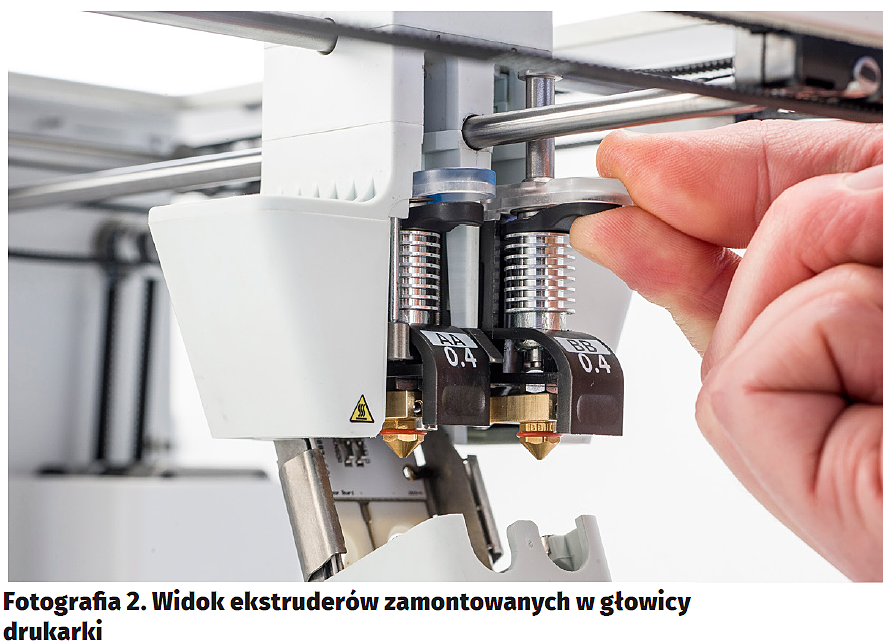 Przygotowanie drukarki do pracy wymaga wykonania kilku nieskomplikowanych czynności. Po pierwsze, z tyłu drukarki trzeba zamontować rodzaj trzpienia, na którym umieszcza się dwie szpule filamentu. Zawiera on antenę systemu NFC, którą trzeba dołączyć za pomocą kabla. Po drugie, trzeba usunąć dwie blokady (pierwsza zabezpiecza głowicę przed przesuwaniem się trakcie transportu, a druga osłonę ekstruderów przed otwarciem się). Po trzecie, wsunąć w uchwyty szklany stolik i włożyć dysze drukujące (zwane w materiałach firmowych PrintCore) w gniazda (fotografia 2). Jeśli planujemy wydruk z użyciem dostarczonego filamentu, to w jednym z gniazd powinien znaleźć się ekstruder „AA” (wydruki z PLA), a w drugim ekstruder „BB” (wydruki z PVA). Ta czynność nie jest skomplikowana i nie przekracza umiejętności, które musimy mieć wymieniając zasobnik z atramentem w popularnej „atramentówce”. Ekstrudery „siedzą” w gniazdach pewnie i stabilnie zabezpieczone specjalną blokadą. Można ją zwolnić naciskając wystające na zewnątrz, przeźroczyste „łapki”. Po czwarte, należy dołączyć zasilacz, włączyć drukarkę i korzystając z menu drukarki załadować filament i już (prawie). Zgodnie z instrukcją dostępną na stronie internetowej producenta, po pierwszym włączeniu drukarka wymaga kalibracji, która powinna się załączyć automatycznie, jednak do redakcji dotarła drukarka, która była już skalibrowana przez producenta. Mało tego – w pudełku wraz z drukarką dostarczono obiekt testowy, który wykonano z jej użyciem. Mimo tego, aby dowiedzieć się, na czym polega kalibracja i trochę „odczarować” opinie krążące po Internecie, wykonałem ją wybierając opcję Calibration z menu Maintenance – napisano o tym dalej.