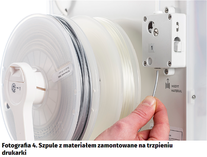 Z tyłu drukarki jest trzpień, na którym wiesza się szpule z materiałem (fot. 4). Materiał to rodzaj „drutu” wyciąganego z tworzywa. Wprowadza się go pomiędzy rolki napędzane silnikiem, dociskane do materiału mocną sprężyną i toczące się po nim. Rolki można rozsunąć za pomocą suwaka na obudowie napędu filamentu. Jeśli materiał zostanie z jakichś powodów zablokowany, to rolki nadal będą się po nim toczyły usiłując go przesunąć. Spowoduje to wytarcie materiału w miejscu docisku rolek, zmniejszenie tarcia i w konsekwencji materiał zatrzyma się. Pół biedy, jeśli zauważymy ten fakt, bo można przerwać wydruk lub ręcznie popchnąć materiał. Jeśli nie, to może okazać się, że głowica przez kilka godzin pracowała „na pusto” i nie powstał żaden obiekt, albo po prostu zmarnowaliśmy materiał.