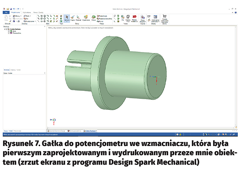 Jak wspomniałem, zanim zacząłem korzystać z drukarki nauczyłem się rysowania obiektów trójwymiarowych w programie DesignSpark Mechanical. Jako pierwszą postanowiłem narysować i wydrukować gałkę do amplitunera, który czekał na nią od jakichś 10 lat, ponieważ dawno zakończono produkcję i nie sposób było jej kupić inaczej, niż z drugim, takim samym amplitunerem. Wygląd gałki pokazano już wcześniej, na rys. 7.