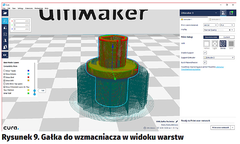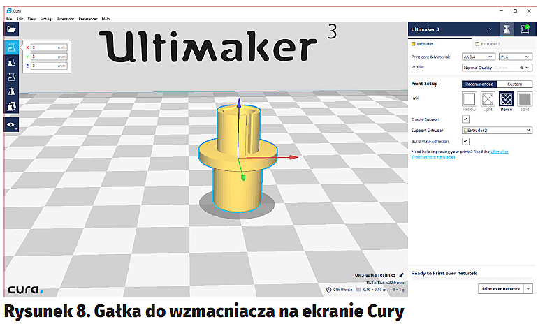 W zasadzie można powiedzieć, że jeśli korzystamy z filamentu firmy Ultimaker oraz drukarki Ultimaker 3, to większość czynności i nastaw jest zautomatyzowana. Program Cura wykonuje za nas pracę podpowiadając prawidłowe parametry dla uzyskania jak najlepszego wydruku. Jednak w razie, gdybyśmy zdecydowali się na inny materiał, to Cura umożliwi nam ustawienie odpowiednich parametrów.