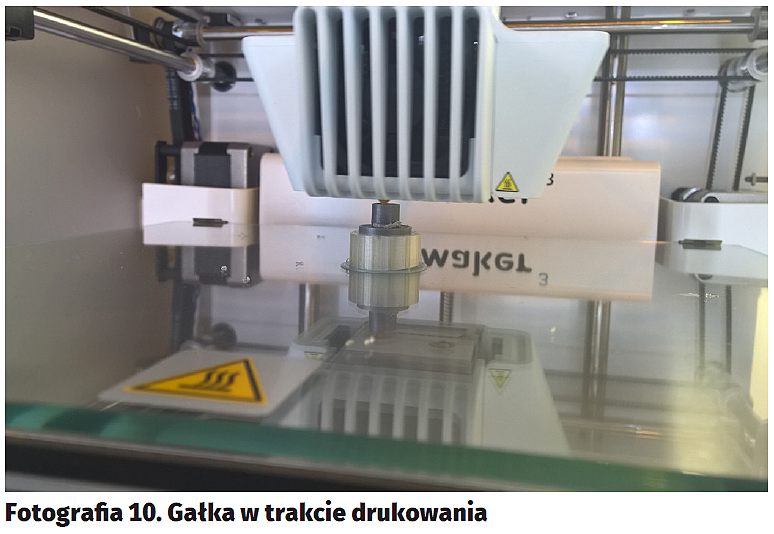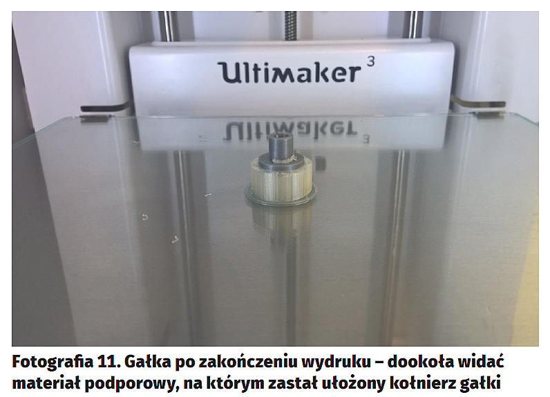 Zanim rozpoczął się wydruk zostało wykonane poziomowanie stolika, a z ekstruderów zostało wyciśnięte nieco materiału w przeciwległych rogach stolika. Następnie rozpoczął się wydruk. Dodam tylko, że po jakichś 15 minutach mogłem cieszyć się gałką (fotografia 10 i 11). Dziś, po dłuższym okresie użytkowania drukarki, dobrze wiem ile błędów popełniłem. Pomimo tego, drukarka wybaczyła mi je wszystkie i wydruk udał się.