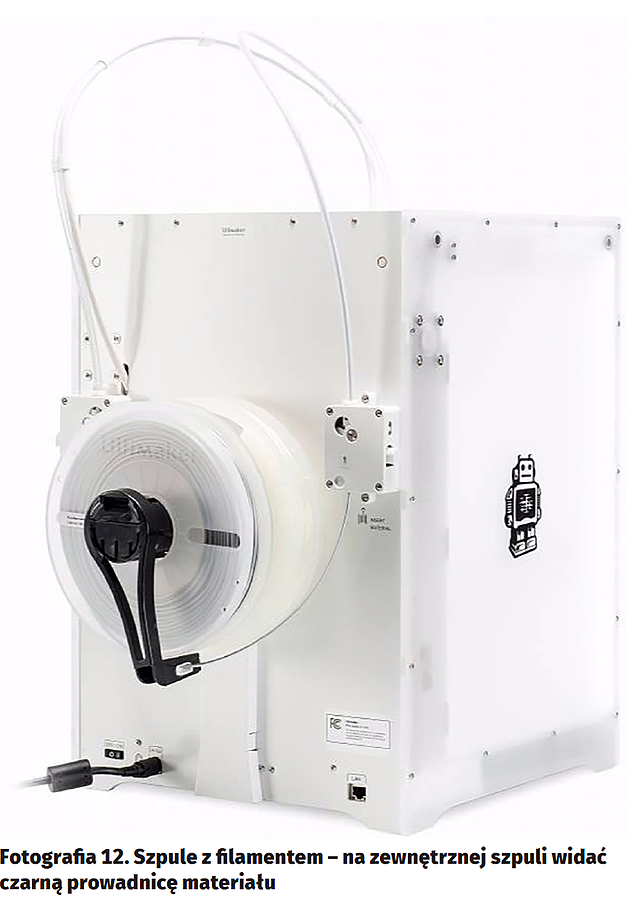 Używałem między innymi nieoryginalnych szpul mieszczących 1 kg filamentu. Były one nieco szersze od dostarczanych przez Ultimakera i o ile bardzo dobrze mieściły się na trzpieniu, to prowadnica przeznaczona dla szpuli numer 2 (zakładana do wnętrza szpuli – fotografia 12) była zbyt wąska na skutek czego nie można jej było założyć i materiał nawijał się na sąsiednią szpulę powodując w ten sposób blokadę możliwości obrotu obu szpul. Problem trzeba rozwiązać samodzielnie – w Internecie są dostępne wzory innych podajników i prowadnic. Wystarczy pobrać i wydrukować – to się nazywa serwis świadczony on line!