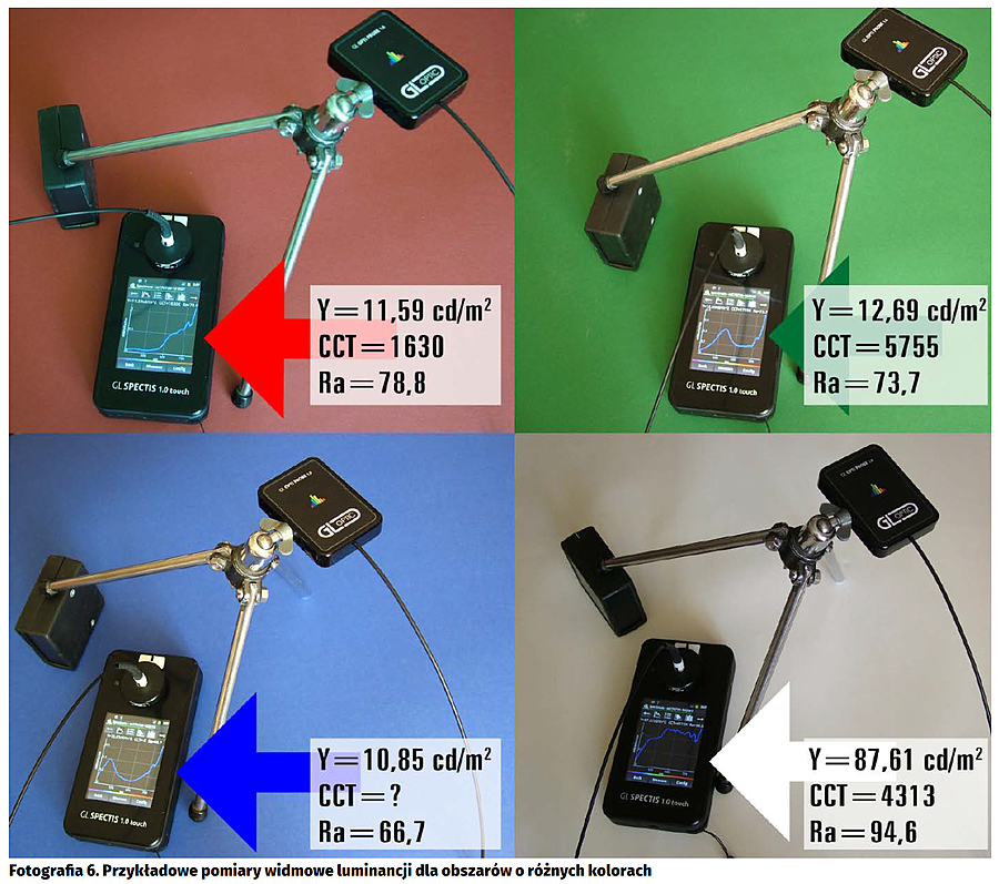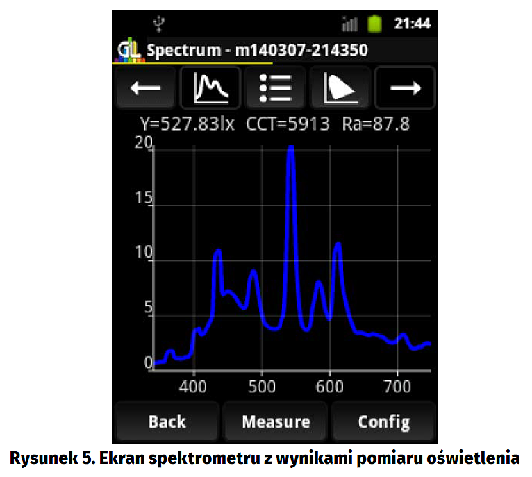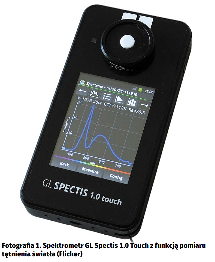 W artykule skupimy się jednak nie na przepisach prawnych, a na aspektach technicznych związanych z pomiarami oświetlenia. Redakcja EP otrzymała do testów i do recenzji spektrometr GL Spectis 1.0 Touch. Jest to uniwersalny przyrząd przeznaczony do pomiaru parametrów kolorymetrycznych i fotometrycznych oraz jeśli klient zamówi taką wersję urządzenia – także tętnienia oświetlenia. Urządzenie współpracuje z programem GL Spectrosoft oferowanym w wersjach: Basic, PRO i LAB.