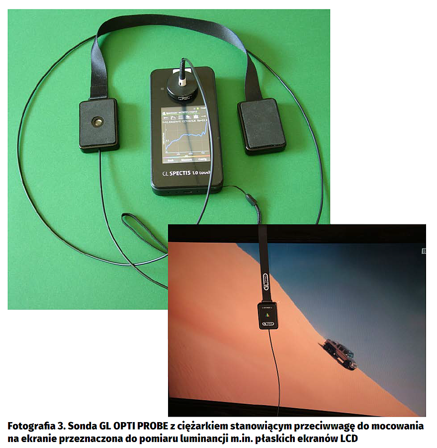- Sonda GL OPTI PROBE z ciężarkiem stanowiącym przeciwwagę do mocowania na ekranie przeznaczoną do pomiaru luminancji płaskich ekranów LCD, LED, plazmowych oraz ekranów projektorów i źródeł światła OLED (fotografia 3).