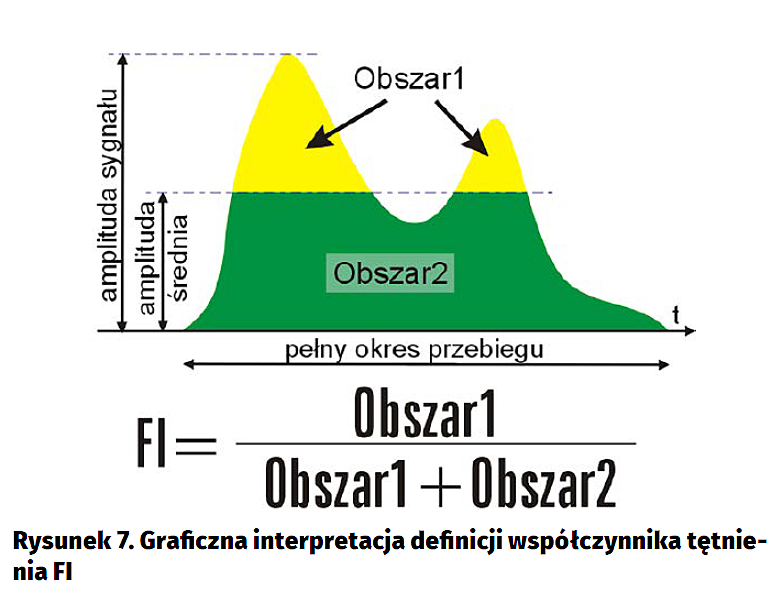 Kolejnym parametrem, który jak już wiemy ma duży wpływ na nasze samopoczucie, jest tzw. flicker, czyli tętnienie światła. Odpowiedni pomiar jest inicjowany naciśnięciem przycisku „Flicker”. W ramach tego pomiaru określany jest współczynnik tętnienia Fi (indeks tętnienia), który można interpretować jako zmieniającą się w czasie luminancję lub widmo światła, przy czym często zmiany te są na tyle szybkie, że nie są postrzegane świadomie przez człowieka. Współczynnik tętnienia Fi jest wielkością niemianowaną (rysunek 7). Jego wartość jest obliczona z uwzględnieniem charakteru tętnienia światła. Ze względu na konieczność całkowania pomiarów wymagana jest odpowiednio duża moc obliczeniowa przyrządu.