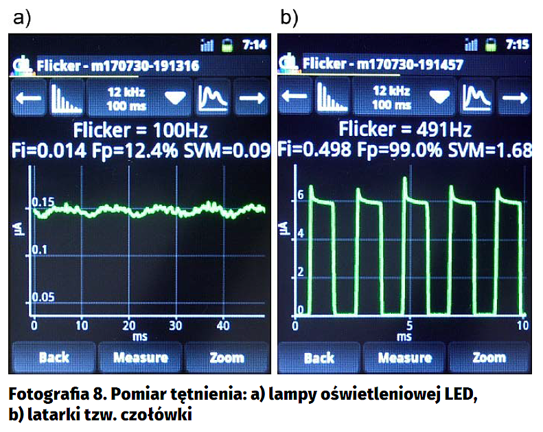 Flicker jest efektem nierozerwalnie związanym z zasilaniem źródeł światła napięciami zmiennymi. Przykładowo, jasność świecenia żarówki zasilanej napięciem o częstotliwości 50 Hz zmienia się dwukrotnie w czasie jednego cyklu zasilania, stąd częstotliwość tętnienia jest równa 100 Hz. Niestety coraz częściej stosowane oświetlenie ledowe charakteryzuje się większym flickerem niż oświetlenie żarówkami tradycyjnymi, a nawet energooszczędnymi. Przykładowy pomiar tętnienia przedstawiono na fotografii 8. Porównano w nim flicker lampy z żarówkami energooszczędnymi i latarki tzw. czołówki. Jak widać, procentowy współczynnik tętnienia lampy jest równy 12,4%, parametr ten dla latarki osiąga wartość aż 99%, co wynika z impulsowego zasilania żarówki. Taki rodzaj zasilania zastosowano w celu regulacji jasności metodą zmiany współczynnika wypełnienia fali prostokątnej. Widać też, że częstotliwość napięcia zasilającego żarówkę latarki jest dużo wyższa niż w sieci energetycznej i wynosi 491 Hz. Dla porównania analogiczny pomiar pokojowego oświetlenia ledowego dał wynik Fp=44% (sic!).