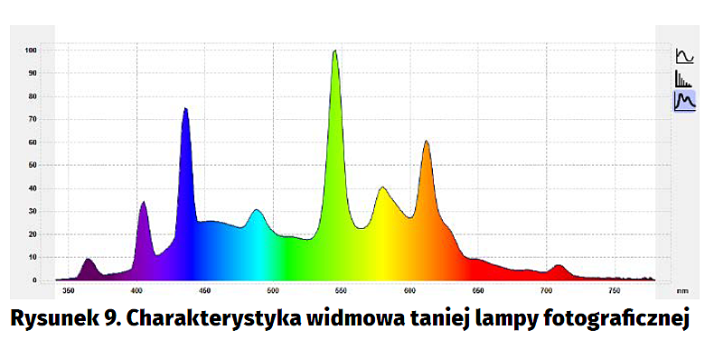 Firmware spektrometru zawiera ponadto kilka funkcji wykorzystywanych do pomiarów wskaźników oddawania barw – CRI, nowe TM-30, Ra. Im wyższą wartość mają te parametry, tym dane źródło światła będzie lepiej oddawało naturalne barwy przedmiotów. Maksymalna wartość parametru Ra jest równa 100. Należy zwrócić uwagę na fakt, że powszechnie stosowane, względnie tanie (chińskie) lampy fotograficzne (luminescencyjne, nie żarowe) nie mają równomiernej charakterystyki widmowej (rysunek 9). Dziury w tej charakterystyce powodują, że lampy te nie mogą mieć Ra=100, a nawet niespecjalnie się do tego ideału zbliżają. Przykładowo, zmierzona w ramach testu lampa sprzedawana jako fotograficzna charakteryzowała się współczynnikiem Ra równym zaledwie 77. Już teraz wiadomo, dlaczego wartości tej nie podano na opakowaniu. Trochę lepiej prezentuje się oświetlenie LED, ale nadal osiągnięcie Ra większego od 90 jest dość problematyczne w tej technologii.