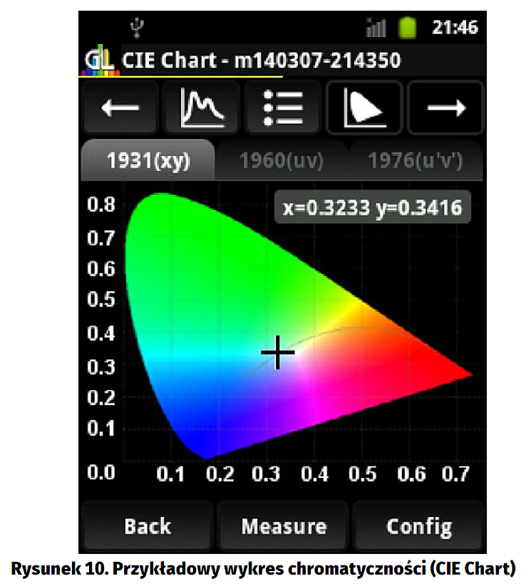 Kolejną formą charakteryzującą mierzone źródło światła są wykresy chromatyczności – funkcja „CIE Chart” (rysunek 10). W praktyce stosuje się kilka modeli, na podstawie których tworzone są wykresy CIE. Modele te są wybierane przez użytkownika po naciśnięciu odpowiedniej zakładki: 1931 (xy), 1960 (uv) oraz 1931 (u’v’).