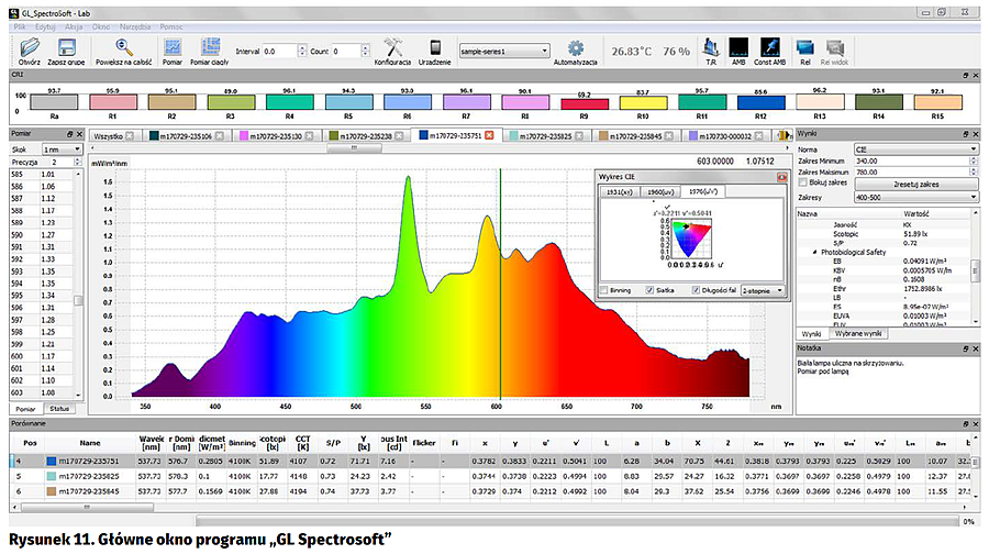 Pomiary spektrometrem dają bardzo dużą ilość informacji. Na szczęście wyniki są dla specjalisty prezentowane dość przejrzyście. Dobrym pomysłem ze strony autorów programu było zawarcie okna „Wybrane wyniki”, którego zawartość ustala użytkownik według własnych potrzeb. Dzięki temu ma zbiorcze wyniki tylko tych parametrów, które go interesują i nie musi przeszukiwać całej kolekcji. Jeśli wykonywane są pomiary porównawcze kilku źródeł światła, to bardzo przydatna jest tabela, w której znajduje się zestawienie wszystkich pomiarów. Taka forma ułatwia porównywanie poszczególnych przypadków.
