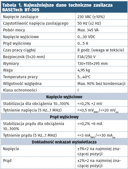 Najważniejsze parametry techniczne zasilacza przedstawiono w tabeli 1. BT-305 to zasilacz liniowy o mocy 150 W. Producent zastrzega, że maksymalny czas pracy ciągłej nie powinien przekraczać 8 godzin. Ograniczenie to prawdopodobnie obowiązuje jednak dopiero po przekroczeniu pewnej mocy maksymalnej dla pracy ciągłej. Trudno bowiem wyobrazić sobie, by przy względnie niewielkim obciążeniu wyłączać zasilacz po 8 godzinach, poza tym nie wiadomo na jak długo. Praktykujących elektroników zainteresują zastosowane rozwiązania układowe. Schemat ideowy jest dostępny w Internecie. W artykule nie będziemy go oczywiście zamieszczać, ale można go pobrać ze strony https://goo.gl/VAeZQe. Z pewnością warto popatrzyć na ten schemat, szczególnie na zastosowane elementy. Prawdopodobnie u wielu Czytelników wywoła on niemałe zdziwienie, ponieważ w zasilaczu zastosowano dużą liczbę wzmacniaczy operacyjnych.