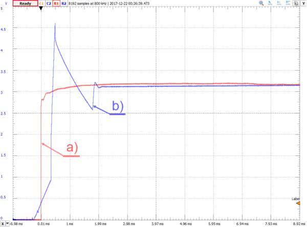 W chwili dołączania obciążenia do zasilacza przyciskiem OUTPUT może wystąpić niewielkie przepięcie na wyjściu (rysunek 4). Należy mieć to na uwadze, gdy dołączane będą układy wrażliwe na podanie zbyt dużego napięcia. Wydaje się jednak, że jest to efekt raczej nieszkodliwy, ze względu na krótki czas trwania impulsu przepięcia. Podczas ręcznego dołączania obciążenia kablem zasilającym efekt ten nie występuje.