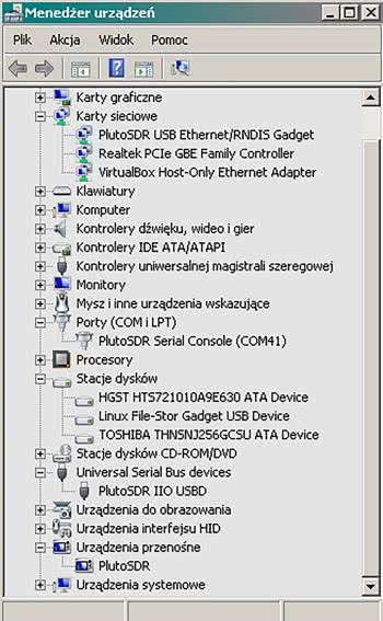 Moduł został przetestowany pod Windows, przy wykorzystaniu oprogramowania IIO-Oscilloscope i SDRSharp. Przed podłączeniem do PC konieczna jest instalacja driverów PlutoSDR-M2k-USB-Drivers.exe. Prawidłowo zainstalowany ADALM-PLUTO występuje w Menedżerze Urządzeń (rysunek 4) jako kilka urządzeń, m.in.: