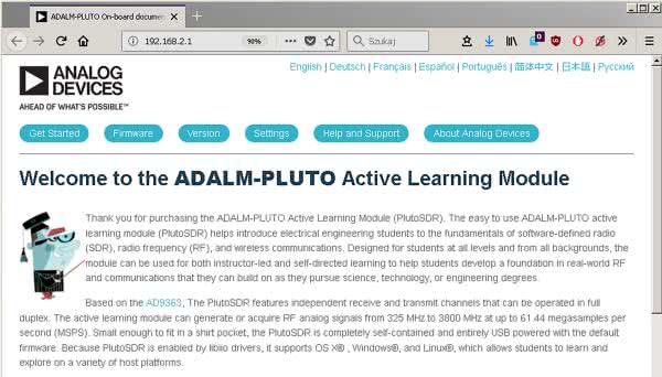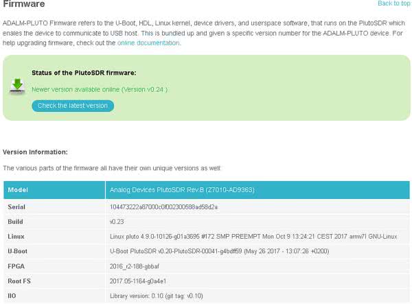 Po zainstalowaniu driverów i podłączeniu zestawu można przejść do testowania. W dowolnej przeglądarce www wpisujemy adres IP modułu 192.168.2.1 (adres można zweryfikować w pliku info.html na dysku PlutoSDR widocznym w menedżerze plików systemu Windows), powinna zostać wyświetlona strona informacyjna PLUTO pokazana na rysunku 5, na której w sekcji firmware (rysunek 6) możemy sprawdzić wersję oprogramowania.