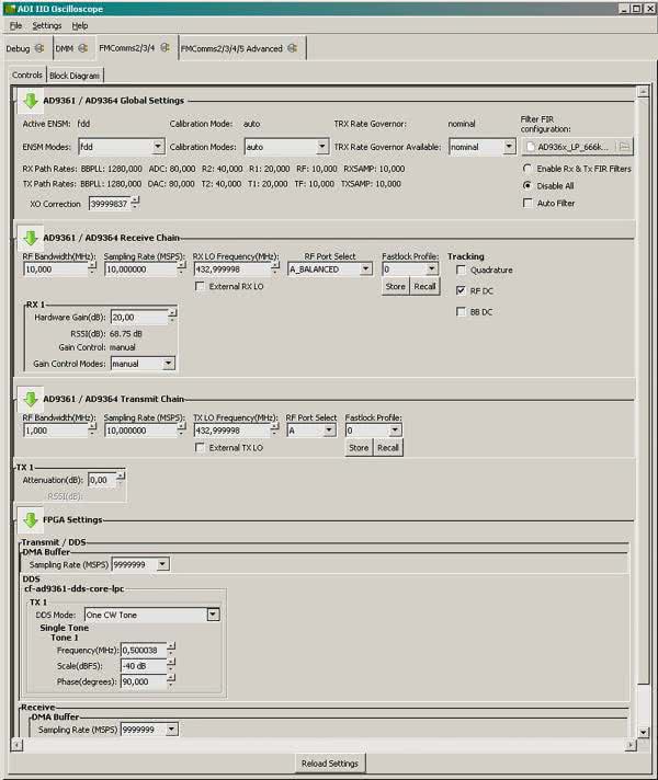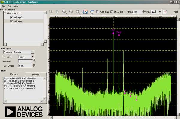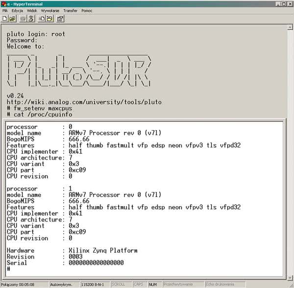 Używając dowolnego terminalu (115200,8,n,1), możemy sprawdzić działanie konsoli (user: root/ Password: analog) i poleceniem fw_setenv maxcpus załączyć oba rdzenie procesora w SoC (rysunek 7). Jeżeli wszystko przebiegło pomyślnie, dla szybkiego sprawdzenia Pluto warto zainstalować i uruchomić oprogramowanie IIO Oscilloscope (https://goo.gl/1qqxFN). W zakładce konfiguracji FMComms2/3/4 mamy możliwość konfiguracji części radiowej PLUTO. Dla przykładu skonfigurowano odbiornik na pasmo nieco pod zakresem ISM, z częstotliwością środkową 433 MHz, a nadajnik na generowanie sygnału 0,5 MHz (rysunek 8).