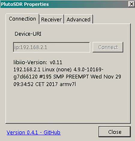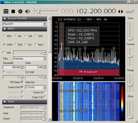 Następnie restartujemy Pluto za pomocą polecenia pluto_reboot reset. Nie znalazłem wytłumaczenia, na czym polega ta przeróbka, ale jest faktem, że pozwala na strojenie SDR znacznie poniżej 325 MHz deklarowanych przez producenta. Pewnie odbywa się to kosztem czułości odbiornika, ale nie spada ona na tyle, by odbiornik stał się nieużyteczny. Dzięki przeróbce zyskujemy dostęp m.in. do zakresu FM, AirBand, oczywiście odbiór jest możliwy po zastosowaniu odpowiadającej pasmu anteny zewnętrznej.
